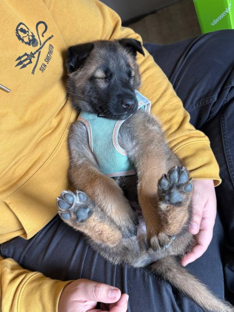 En attendant, Claude découvre une toute autre réalité. Entouré, rassuré, il profite de ses premiers moments de calme et de douceur. Sur cette photo, il repose paisiblement sur les genoux de sa famille d’accueil.