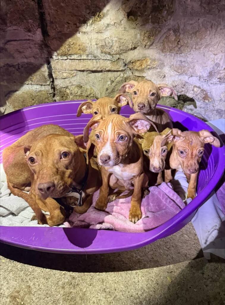 La chienne et ses cinq chiots ont été placés dans notre pension partenaire malgré le cruel manque de place. Outre sa maigreur, nous craignons une fracture qui devra être confirmée par des examens vétérinaires.