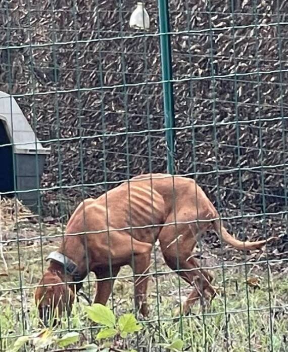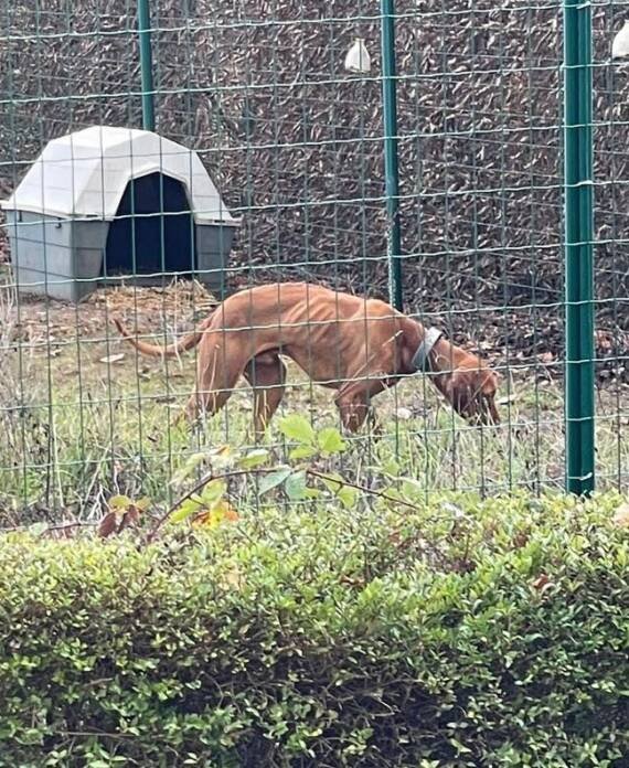 Deux mois plus tard, Action Protection Animale reçoit un signalement alarmant : un jeune chien squelettique est enfermé dans un enclos, complètement laissé à l’abandon. Nous intervenons immédiatement.