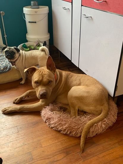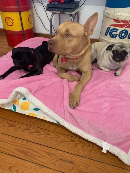Aujourd’hui, il est comblé : entouré de deux adorables carlins, choyé et couvert d’amour. Il profite pleinement de ses jouets et de cette nouvelle vie où chaque jour rime avec affection.