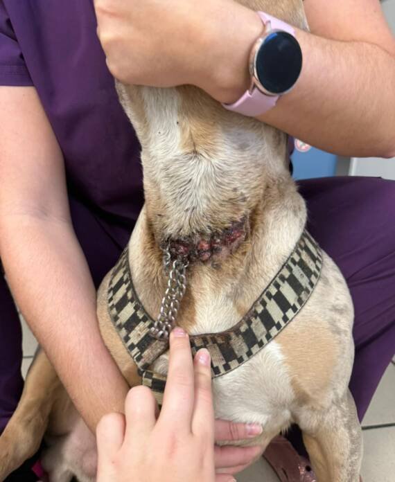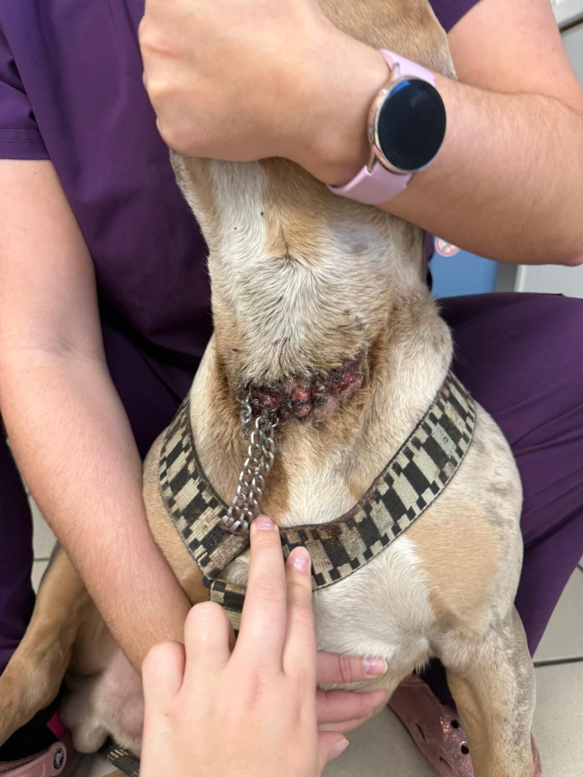 Soit il était détenu de façon prolongée à l’attache et il a réussi à casser sa chaîne, s’entaillant sévèrement le cou avant d’être laissé sans aucun soin ; soit il a été contraint de porter un collier étrangleur trop serré qui a fini par l’étrangler en grandissant, puis lui a entaillé les chairs.